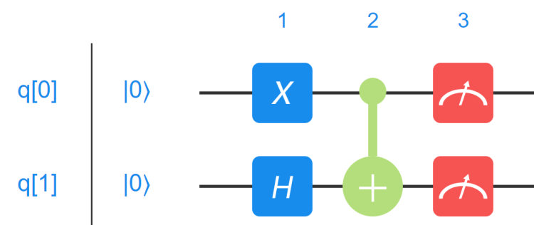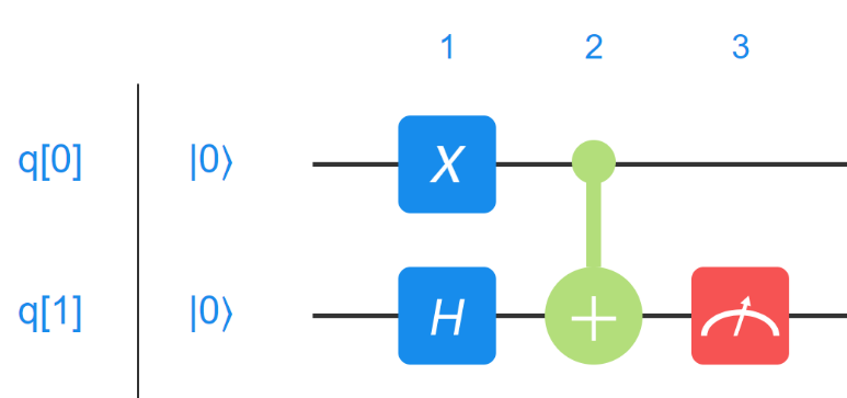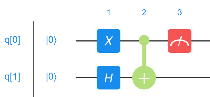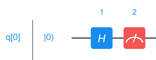 在该量子线路中,初始态 q[1]、q[0]代表量子比特的初始态均为|0〉,因此该系统的复合量子态为|00〉,这里复合量子态|00〉的从左到右依次对应高位比特到低位比特。首先